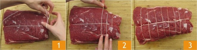 To prepare the braised beef with Buttafuoco, first remove the excess fat and sinew from the chuck roast and proceed with tying it to give it a regular shape: tie the meat lengthwise with kitchen twine, then create a loop 1 and pass the meat through it. Continue in this way, spacing the loops a couple of inches apart 2 until you create a cage that you secure with a double knot 3.