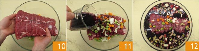 Place the meat in the bowl 10 and pour the wine 11 to completely cover it 12. Cover with plastic wrap and let it marinate for half a day, or overnight, in the refrigerator, turning the meat a couple of times.