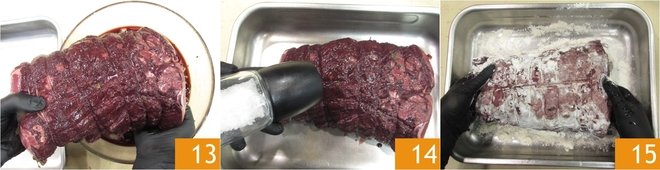 After this time, take the meat out of the marinade 13, dry it and place it in a baking pan, then salt it 14 and flour it well on all sides 15.
