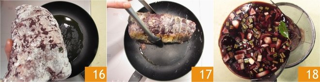 Brown the floured meat in a pan with a drizzle of oil 16, turning it on all sides with tongs to seal it well and avoid piercing it 17. Set the browned meat aside and drain the marinade vegetables, filtering the liquid and setting it aside 18.