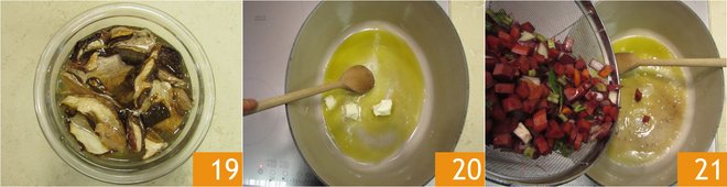 Meanwhile, soak the dried mushrooms in water for about 30 minutes 19. In a large saucepan, melt the butter in the oil 20, then add the marinade vegetables 21.