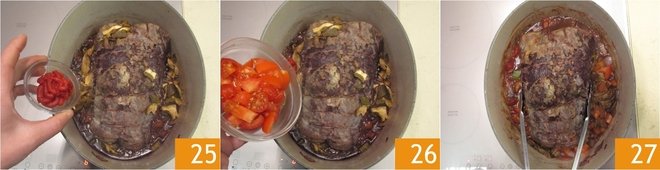 Add the tomato paste 25 and the roughly chopped fresh tomatoes 26, then turn the meat with kitchen tongs 27.