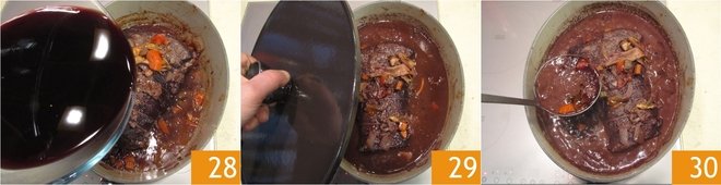 At this point, pour in the marinade wine 28: the meat should be covered two-thirds. Cover with a lid 29 and cook over moderate heat for 3 hours. Occasionally baste the meat on the surface 30 and check that it does not stick to the bottom, making sure the liquid is always boiling.