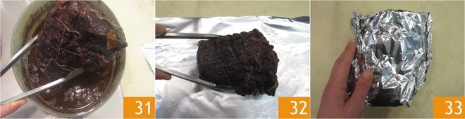 After the cooking time, remove the meat from the saucepan 31 and place it on a sheet of aluminum foil that you have previously buttered 32. Keep the meat in the parcel to keep it warm and prevent it from drying out 33.