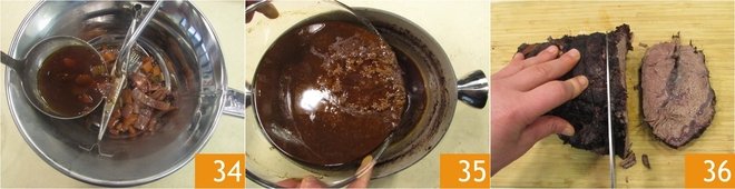 Also take out the vegetables and pass them through a food mill to remove the fibers 34, then blend the mixture with an immersion blender through a chinois sieve to make the sauce more refined. Pour the sauce back into the saucepan 35 and reduce it on the stove. Now take the braised beef and remove the twine, then cut it into slices 36.