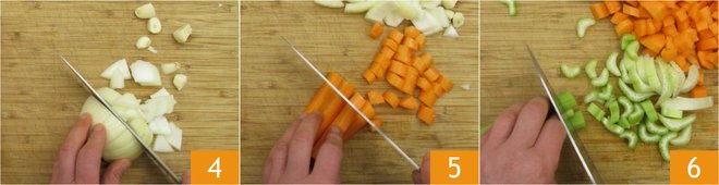Move on to the vegetables: after cleaning them, cut the garlic and onion into fairly large pieces 4, then coarsely chop the carrot 5 and celery 6.