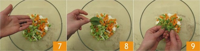 Pour all the vegetables into a very large bowl along with the juniper berries and cloves 7, then add the bay leaves 8 and marjoram leaves 9.