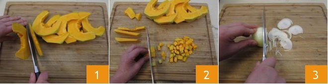To prepare the braised beef with pumpkin, start by preparing the vegetable broth. Once ready, clean the pumpkin: peel it, remove the seeds and inner fibers, then cut it first into slices 1 and then into cubes 2. Peel the onion and slice it thinly 3,