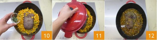 Add the chopped rosemary 10, salt, a pinch of pepper, cover with a lid 11, and let cook for 2 and a half hours on low heat, occasionally turning the meat and pumpkin 12.