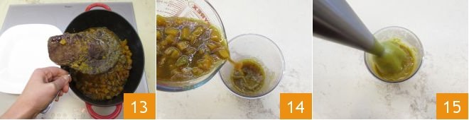 Once the meat is cooked and tender, remove it from the pot and place it on a plate 13, keeping it warm. At this point, set aside some pumpkin cubes for the final garnish and blend the rest with the cooking juices (14-15), until you obtain a cream.
