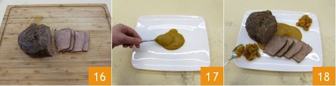 Now slice the meat 16, lay a bed of pumpkin cream on a serving plate, place the meat on top, and garnish with the reserved pumpkin cubes. All that's left is to enjoy your braised beef with pumpkin, still warm!