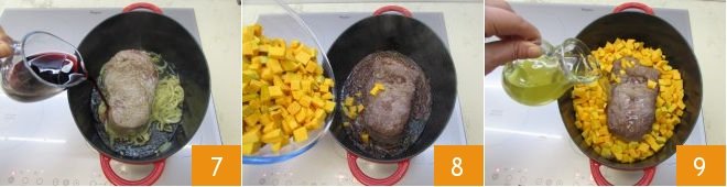 then deglaze with the red wine 7. Once the alcohol has completely evaporated, add the pumpkin cubes 8 and the vegetable broth 9.