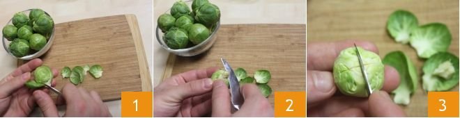 To prepare braised Brussels sprouts with beer, first remove the outer leaves from the sprouts 1, trim off the protruding bottom part 2, and cut a cross into them with a small knife 3.