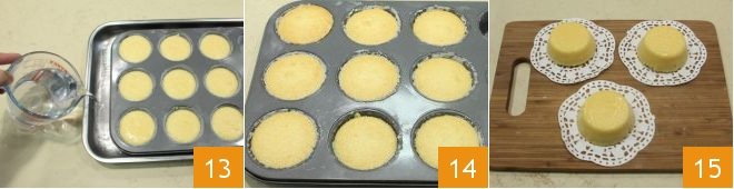 and pour it into the large tray 13 containing the mold, the water should cover two-thirds of the molds. Bake in a preheated static oven at 350°F for 40 minutes (or 320°F fan oven for 30 minutes). Once cooked, take your quindim out of the oven 14 and let them cool before unmolding, turning the mold over onto a tray. The Brazilian quindim are ready to be enjoyed 15.