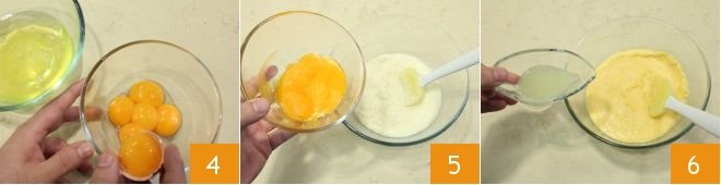 Separate the egg whites from the yolks 4 and incorporate the yolks into the mix 5. Add the lime juice 6 and the coconut milk. Mix the ingredients with a spatula to combine.