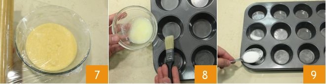 Then cover with plastic wrap 7 and let it rest for 15 minutes. Meanwhile, butter a cupcake mold 8 and sprinkle it with granulated sugar 9 and place it inside a larger baking tray, this will be used for the bain-marie cooking method.