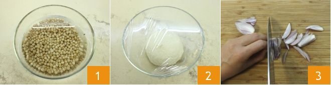 To prepare the bread bowl with chickpea velouté, start by rehydrating the dry chickpeas the night before: place them in a bowl, cover them with water, and let them rest for 12 hours 1. You can also use pre-cooked chickpeas, skipping this step. Then proceed with preparing the bread dough by consulting our Cooking School: Bread dough; alternatively, you can use 10 g of fresh brewer's yeast. Once the dough is formed, shape it into a round form, transfer it to a bowl, cover it with plastic wrap, and let it rise in a dry and warm place for about 1 to 1.5 hours 2, until it has doubled in volume. Then clean and peel the shallot and finely chop it 3.