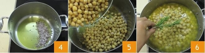 Heat a drizzle of oil in a high-sided pot and sauté the chopped shallot 4. After the necessary time for rehydration, drain the chickpeas, which will have softened, and add them to the pot 5. Sauté the chickpeas for a couple of minutes over medium heat, then cover with vegetable broth (to learn how to prepare and store it best, consult our Cooking School: Vegetable broth) and add 2 sprigs of rosemary for flavor 6.