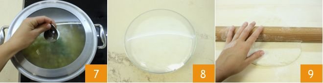 Cover the pot with a lid and let it cook on low heat for about 2.5 hours 7. Meanwhile, prepare the small bowls: once the bread dough has doubled in volume 8, remove the plastic wrap, transfer it to a lightly floured work surface, and roll it out with a rolling pin until you get a round sheet about 0.2 inches thick 9. Divide it into four parts using a pastry cutter.