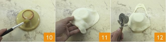 At this point, take 4 terracotta or heat-resistant glass bowls with a diameter of 4 inches, turn them upside down on the work surface, and oil the outer surface with a brush 10. Then place the dough over the bowls 11, pressing it well and removing the excess parts with a pastry cutter 12.