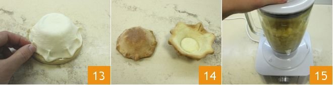 Shape the edges of the bowls, forming some pleats 13, then bake in a preheated static oven at 392°F for 15 minutes until the surface is slightly golden; if using a fan oven, bake at 356°F for 10 minutes. Then unmold the dough and place it inside the bowls so that the inside cooks too 14. Put it back in the oven at 392°F for 10 minutes or at 356°F for 5 minutes if baking in a fan oven. While the bread bowls are baking, remove the rosemary sprigs from the chickpea soup and transfer everything to a blender 15.