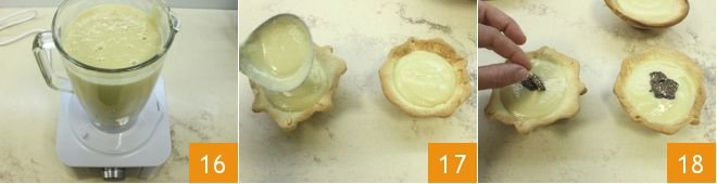 Blend for a few seconds until you get a smooth and homogeneous mixture 16. Now pour the chickpea velouté into the bowls 17 and decorate with black truffle flakes 18. Your bread bowls with chickpea velouté are ready to be served hot!