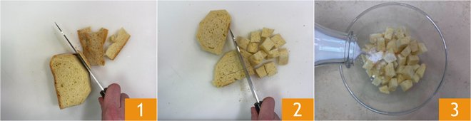 To prepare the bread patties in a pan, cut the bread into slices and remove the crust 1, then break it into small pieces 2. Transfer the bread into a bowl, pour the milk and let it soften for a few minutes 3.