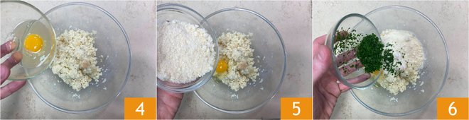 Add the egg 4, grated cheese 5, and parsley 6.