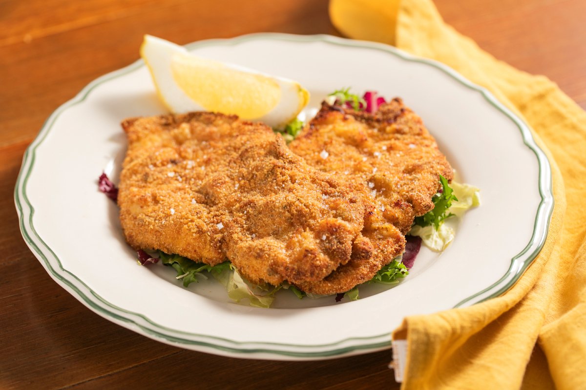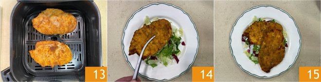 Cook at 392°F for 10 minutes, turning the cutlets halfway through cooking, until they are nicely golden and crispy 13. Once ready, serve them immediately while hot, finishing with a pinch of flaky salt and accompanying them with a side of fresh salad 14 15!