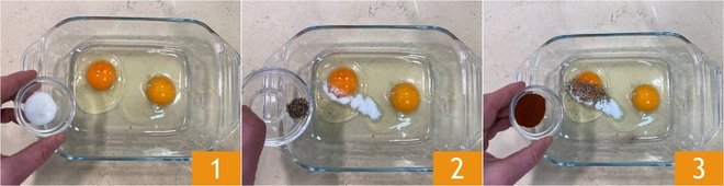 To prepare the air fryer chicken cutlets, start by placing the chicken breast slices on a cutting board. If they are too thick, gently pound them with a meat mallet until you get an even thickness of about 3/8 inch. In a shallow dish break the eggs and season with salt 2, black pepper 2 and sweet paprika 3.