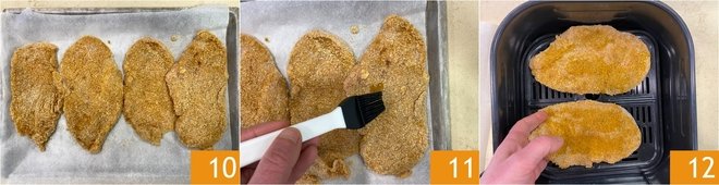 Continue this way with all the slices, arranging them as you go on a tray lined with parchment paper 10, then brush them lightly with oil on both sides 11. Preheat the air fryer to 392°F for a few minutes, then place the cutlets in the basket without overlapping (cook 2 at a time, depending on the basket size) 12; we used a 6.5 L (about 6.9 qt) air fryer.