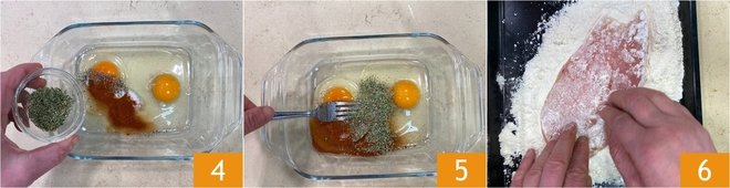 Add the dried oregano 4 as well and beat everything with a fork 5. Pour the flour into one tray and the breadcrumbs into another. Coat each chicken slice first in the flour, making sure to cover it completely 6.