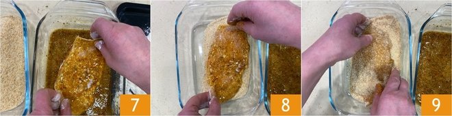 Then dip it into the eggs 7 and finally bread it in the breadcrumbs 8, pressing well with your hands so the coating adheres on all sides 9.