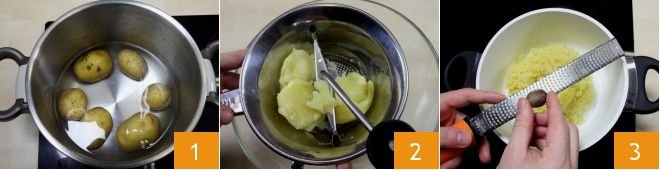 To prepare the breadsticks with delicate truffle cream, start with the potato cream: wash them under running water to remove the dirt, then place them in a large pot and cover them with water 1. Cook them for about 40 minutes or until you can pierce them with a fork. Once cooked, peel them and pass them through a food mill 2 collecting the pulp in a small bowl. Salt and pepper to taste then transfer the mashed potatoes into a large pot and add the grated nutmeg 3.