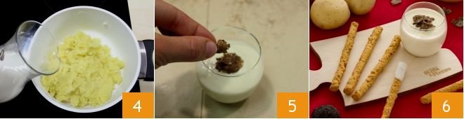 At this point, pour the warm milk or warm cream slowly 4 stirring with a wooden spoon and cook over low heat, continuing to stir until the cream has thickened (it should coat the spoon). If it becomes too thick, you can add more milk or cream. Once ready, transfer it into the glasses (you can use 4 oz glasses or a single container) and add the black truffle flakes 5. Then serve your breadsticks accompanied by the delicate truffle cream 6!