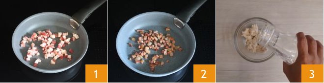 Place the smoked bacon cubes in a pan 1 and brown them for about 5 minutes, stirring often. Let them cool completely 2. Break the refreshed sourdough into a bowl, pour in 50 g of lukewarm water taken from the total amount 3.