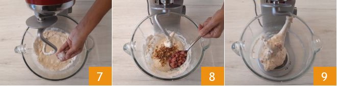 Knead for 10 minutes, then stop the mixer and add the fine salt 7, dried onion, and crispy bacon 8. Continue kneading until the dough is well combined 9.