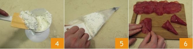 Using a spatula, mix the ingredients until well combined and transfer the mixture into a disposable piping bag fitted with a fairly large plain tip 4. You can use a spatula to help push the filling down into the piping bag 5. Then move on to the bresaola. Arrange the bresaola slices on a cutting board and fold them by bringing the ends together so that one end forms a smaller hole and the other a wider opening, shaping them into a cone 6.