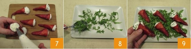At this point, take the filled piping bag and fill the bresaola cones 7, then garnish the outside of the cones with additional chopped chives if desired. Now take a plate and lay a bed of arugula 8. Place the bresaola cones on the arugula bed 9 and serve them to your guests!