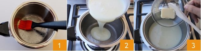 To prepare the brigadeiro, start by evenly greasing a high-sided pot to prevent the mixture from sticking during cooking 1. Pour the condensed milk into the pot and turn on medium heat 2. Add 2 teaspoons of butter 3