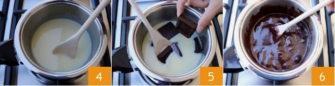 and gently stir with a wooden spoon to melt it completely 4. Add the chopped dark chocolate 5 and stir occasionally, cooking the mixture for 15 minutes: it should reach a creamy, compact consistency 6 and detach from the bottom of the pot.