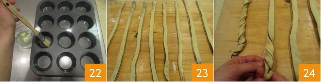 Butter a muffin tin 22 and preheat the oven to 355°F. Space out the strips of dough to work more easily 23 and twist them on themselves 24.