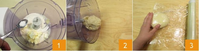 To prepare the brisé baskets with goat cheese and herbs, start with the base dough. In the mixer, pour the flour, cold butter in pieces, and salt 1 and activate the blades until you get small crumbs. Add the cold water slowly, and as soon as the mixture compacts, transfer it to the work surface 2. Quickly compact it with your hands to form a ball and wrap it in plastic wrap. Let it rest in the refrigerator for at least 2 hours 3.