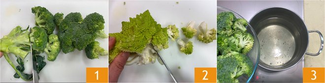 To prepare the broccoli balls, first clean the broccoli: remove the leaves from the green broccoli and take only the florets 1, then do the same with the Romanesco broccoli 2. Plunge all the florets into a pot of boiling water 3.