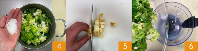 Add the salt 4 and cook until they are tender. Meanwhile, dice the scamorza 5. Drain the broccoli and transfer them to a mixer 6, then blend until you get a smooth mixture.