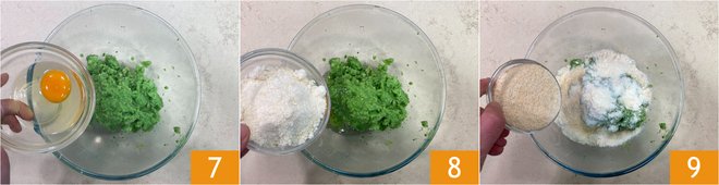Pour the mixture into a bowl and add the egg 7, grated Parmesan 8, and breadcrumbs 9.
