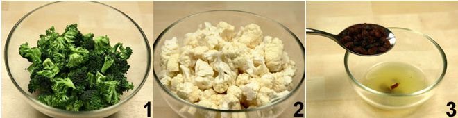 Clean and cut the broccoli 1 and cauliflower 2 into small florets so they can be eaten in one bite, keeping the cauliflower stalk. Boil the broccoli and cauliflower pieces in salted boiling water in separate pots (they have different cooking times) until tender but still crunchy. Meanwhile, soak a tablespoon of raisins in lemon juice 3.