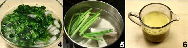 Place the freshly drained broccoli in an ice bath 4 to cool them immediately, maintaining their crunchy texture and bright green color. Once cool, drain them. Retrieve the cauliflower stalk, cut it into two pieces, and boil them together with the parsley stems 5 that you have washed and cut into pieces. When the stems are tender, drain them and blend in a mixer, adding some of their cooking water until you obtain a thick and velvety cream. In the blender glass (or mixer), pour the oil, lemon juice, cauliflower cream, parsley stems, mustard, and a dash of nutmeg, then blend 6. Finally, adjust with salt and pepper.