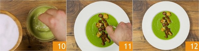Finally, adjust the salt 9 and pepper. Garnish with crispy bacon and toasted bread cubes, drizzle with raw olive oil 11, and serve your broccoli cream with crunchy croutons immediately 12!