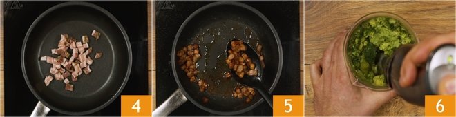 Meanwhile, cut the bacon and sandwich bread into cubes. Sauté the bacon in a pan over moderate heat 4 until it becomes crispy and golden 5. Set the bacon aside, leaving the fat in the pan, and use it to toast the sandwich bread. Once cooked, drain the broccoli and save the cooking water. Blend the broccoli with an immersion blender 6.